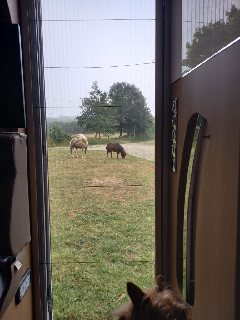 Wir stehen wieder mal alleine und bekommen Besuch vom Haushund und später von zwei Pferden 😃.